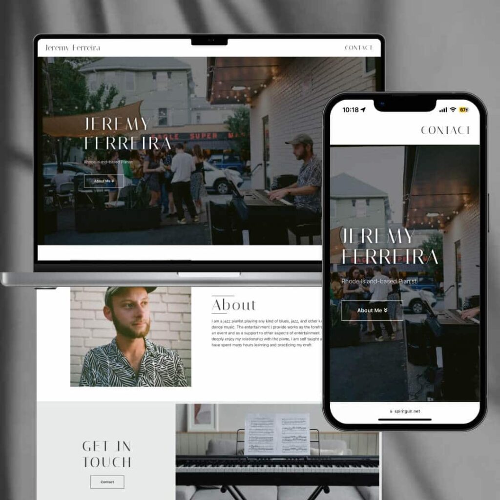 Spiritgun.net is a 2-page website created for Rhode Island-based Pianist, Jeremy Ferreira. This site serves as his digital business card with plans to add a portfolio to showcase his talent. This site was built with Elementor using their “Wedding Photographer” template, and converted from Elementor’s Sections to the Flexbox Containers to improve the site speed.